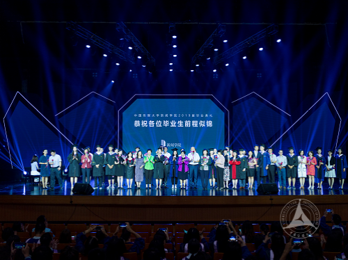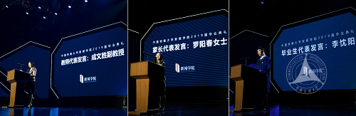 教师代表成文胜副教授、毕业生代表李忱阳同学、家长代表罗阳春女士依次发言,从各自的角度表达了对学校、学院的感谢和对毕业生的祝福。随后,在场的全体教师登上舞台和同学们道别,毕业生代表也向老师们献上诚挚的感谢。