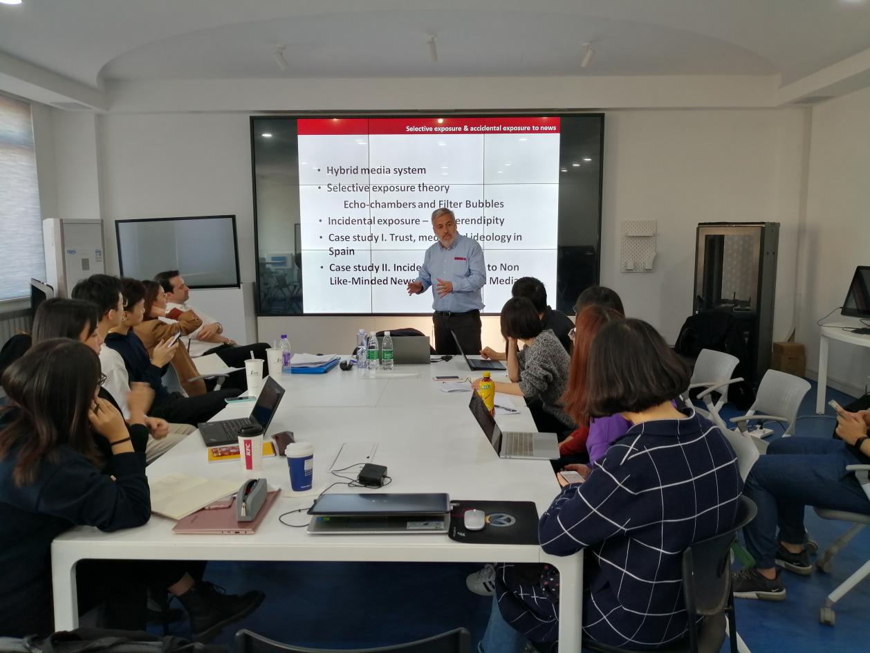 此次,新闻学院“海外主题工作坊”的题目为“未来新闻学:路径与方法”,担任主讲的两位教授分别为西班牙布朗卡纳大学传媒与国际关系学院副院长Pere Masip教授与Jaume Suau教授。由他们领衔的Digilab研究小组,近年来一直关注新闻学研究的前沿话题,科研成果颇丰。工作坊期间,他们分别为新闻学院师生带来了题为“参与式新闻”(Participatory Journalism)、“社交媒体与议程设置”(Social Media and Agenda-setting)和“虚假信息、后真相与假新闻”(Disinformation, Post-truth and Fake News)的讲座。