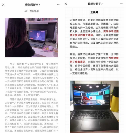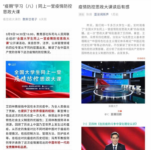 直播结束后,同学们反响热烈,新闻学院2017级新闻学(数据新闻报道方向)和2017级新闻学等班级还通过微信公众号,发表了同学们的学习体会。学生们从全国人民万众一心、携手抗疫中感受理想信念的力量;从医护人员的奉献和公民个体的自觉中明白小我与大我的关系;从中国向世界各国分享抗疫经验,提供借鉴意见看到大国的担当作为;还有同学从专业角度出发,对新闻传播和舆论导向在抗疫中的作用进行了深入思考。