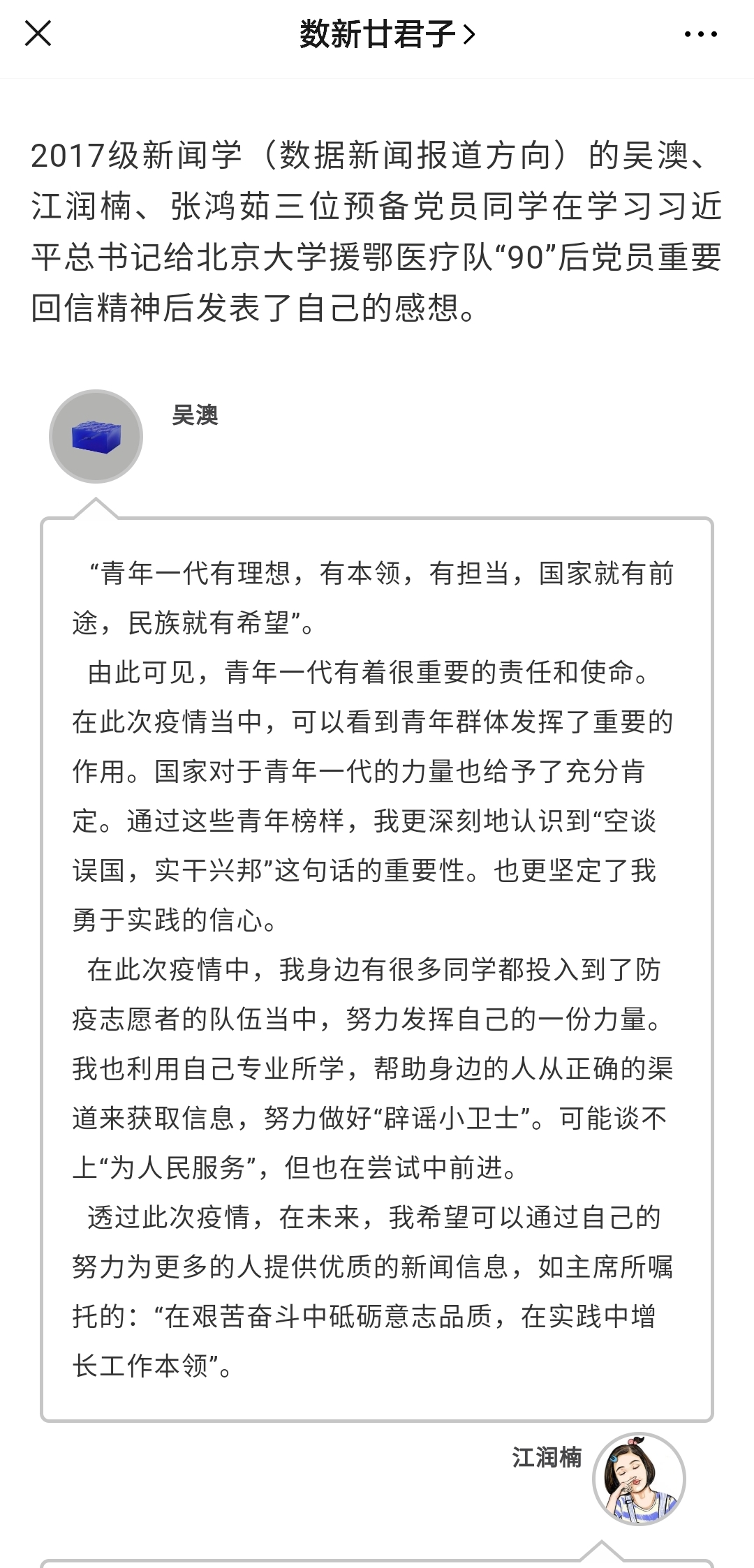 (通讯员 南秀渊)3月15日,习近平总书记给北京大学援鄂医疗队全体“90后”党员回信,对广大青年人为疫情防控作出的贡献表示赞扬,对青年一代的发展和成长寄予厚望。近日,新闻学院2017级新闻学(数据新闻报道方向)和2017级新闻学等班级组织学生在线学习了回信精神,并分享了心得体会。