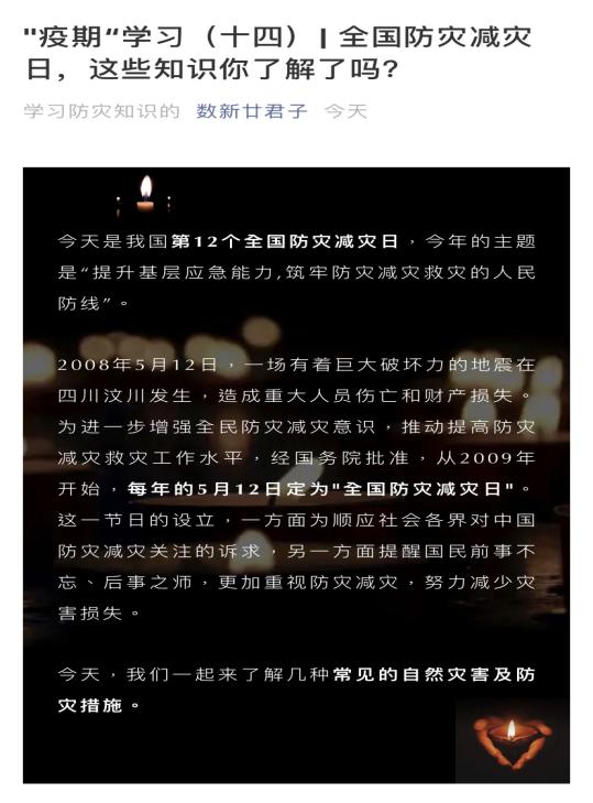 (通讯员 张可馨 南秀渊)5月12日是全国防灾减灾日,今年全国以“提升基层应急能力,筑牢防灾减灾救灾的人民防线”为主题,通过多种形式普及防灾减灾知识和自救互救技能。围绕防灾减灾这一主题,新闻学院学生自主开展多种线上学习活动,以加强同学们的防灾应急意识。学生们还结合正在经历的新冠肺炎疫情,表达了自己的切身感悟。