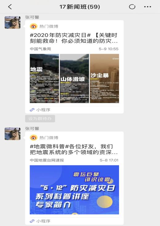 2017级新闻学同学在班级微信群推送了各类防灾减灾学习视频,武汉籍的李沁芳同学总结到:“曾经我也以为灾难离自己很遥远,但是猝不及防的新冠疫情告诉我们,灾难就在我们身边潜伏着,防灾减灾知识真的是可以救命的必备技能。最后,还要感谢一直默默守护我们的防疫人员、消防人员、执法人员以及其他社会工作者,是你们的付出换来的我们其他人的平安。”
