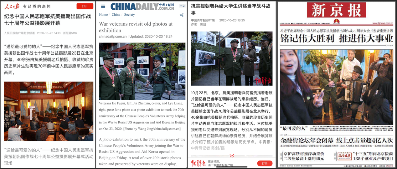 (通讯员 陈逸飞)10月23日上午,由新闻学院师生组织的“送给最可爱的的人”——纪念中国人民志愿军抗美援朝出国作战七十周年公益摄影展在北京举办开幕仪式,40余张由抗美援朝老兵拍摄、收藏的珍贵历史照片生动再现了70年前中国人民志愿军的真实画面。人民日报、中国日报、中国青年报、中国摄影报等多家媒体对活动进行了报道,《新京报》在24日头版刊出活动现场照片。