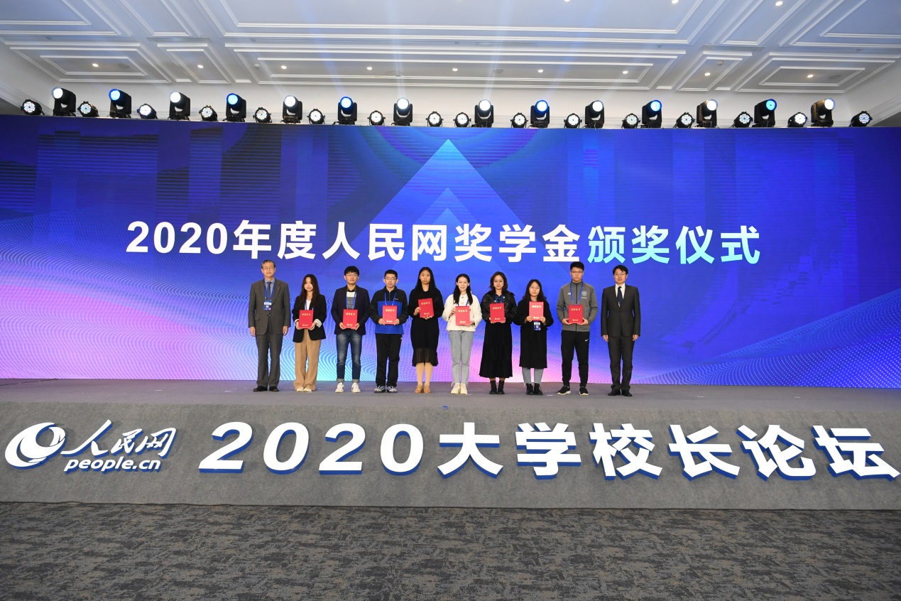 “人民网奖学金”颁奖典礼是以“奋进‘十四五’开创教育高质量发展新局面”为主题的2020年人民网大学校长论坛的重要环节。共有来自14所人民网奖学金院系推荐的55名同学获得2020年度“人民网优秀学生奖学金”,来自12所学校13个院系的105篇融媒体作品荣获“人民网奖学金优秀融媒体作品奖”。