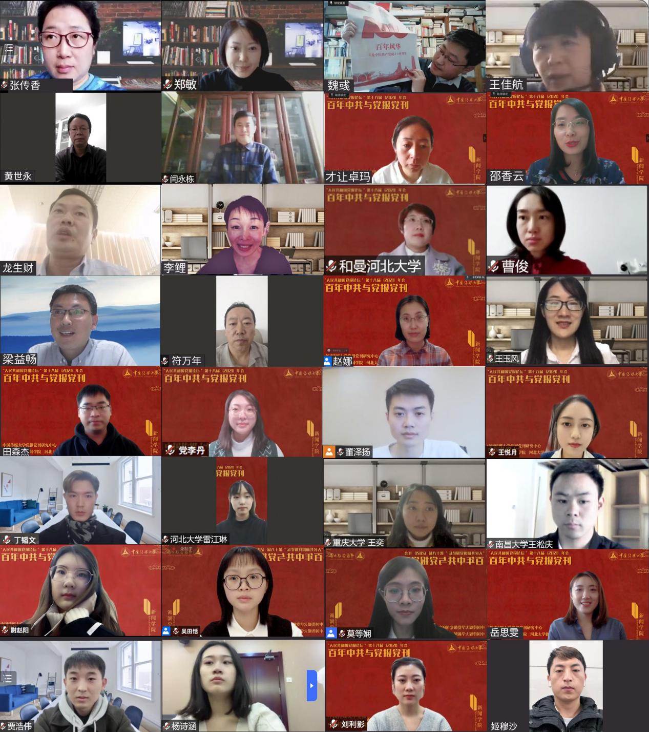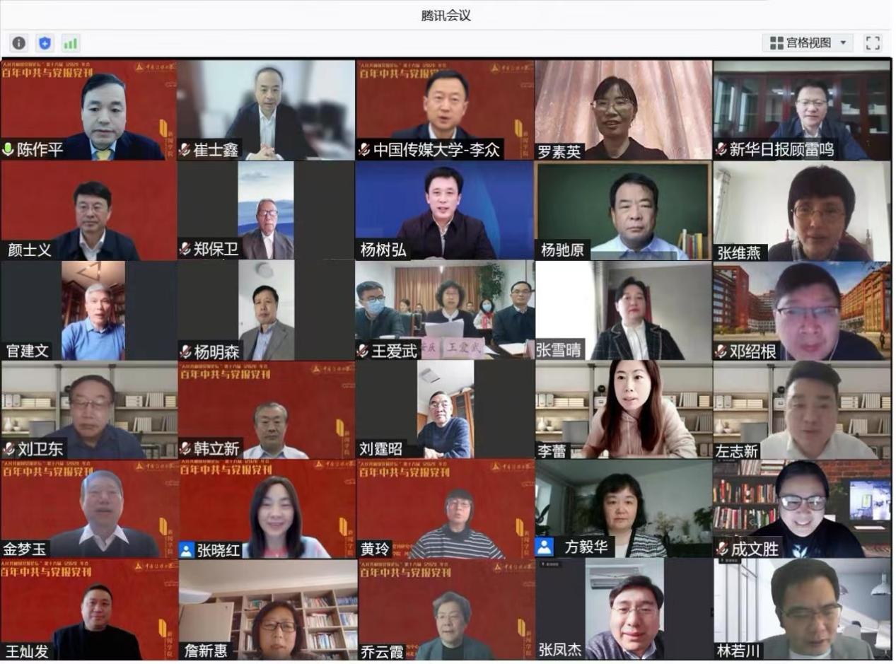 本届年会由中国传媒大学党报党刊研究中心、中国传媒大学新闻学院与河北大学新闻传播学院联合主办,采取线上直播的形式。来自人民日报社、求是杂志社、新华日报社、北京日报社、重庆市委当代党员杂志社、传媒杂志社、新华社《中国记者》杂志等19家中央及地方党报党刊主流媒体,中国传媒大学、中国人民大学、河北大学、广西大学、天津师范大学、南开大学等16所高校、科研机构以及安徽省安庆市委宣传部的嘉宾,相聚腾讯会议云端,围绕中共百年党报党刊发展、党的新闻理论与新闻思想、新时代党报党刊的创新实践以及媒体深度融合发展等议题展开交流研讨。与会代表共计80余人。