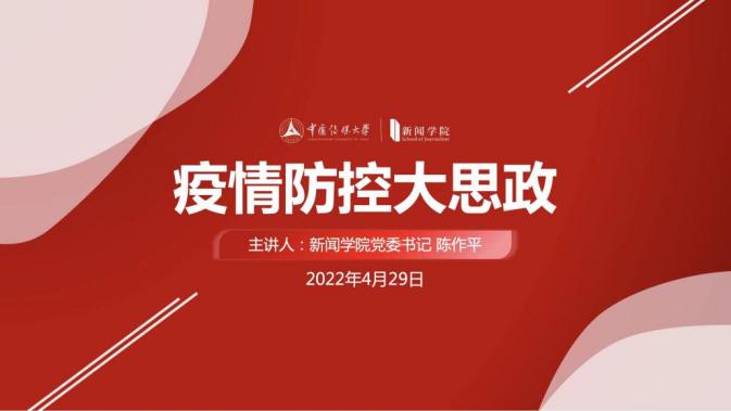 在一个多小时的课程中,陈作平书记首先通报和分析了国内疫情防控的有关情况;接着从如何看待动态清零和与国外与病毒共存的躺平、如何看待疫情防控工作中存在的问题和如何看待中国的疫情防控工作的后续发展三个方面,向师生阐述了当下看待国内疫情防控政策时应具有的正确认知与态度;最后部署了新闻学院常态化疫情防控的做法以及校园封闭管理期间的应急预案。