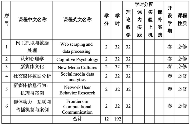 3.经过方法、技术类课程的训练,具备数据收集和处理、建模以及测试的操作技能,满足数字智能时代对计算传播人才的基本要求。