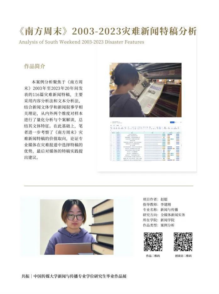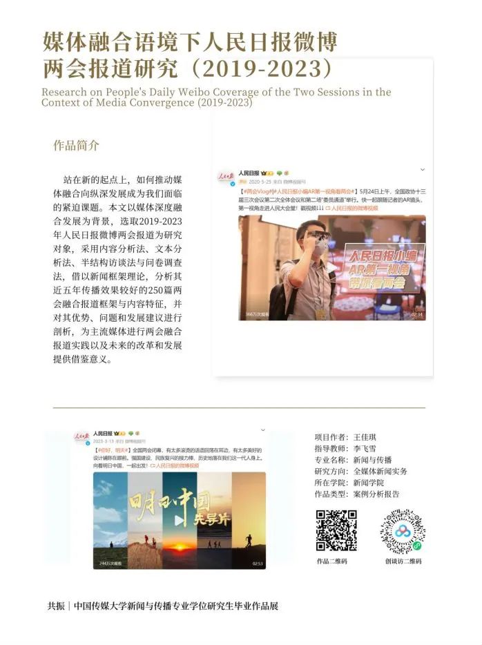 新闻学院的新闻与传播专业硕士培养下设全媒体新闻实务与媒体市场调查(舆情分析,2023级起)两个方向。学生们根据培养方案的规定,以三种类型的毕业作品呈现两年来的学习与研究成果,分别是新闻与纪实作品、调研报告(包含媒体市场调查报告)和案例分析报告。