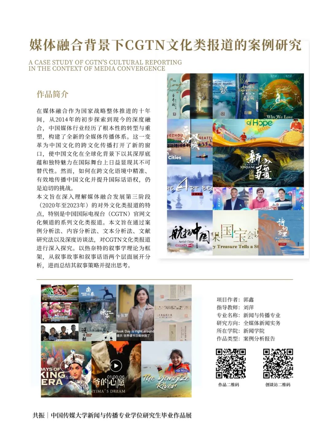 在快速变化的媒介环境中,当下新闻传播学专业硕士的教育面临着前所未有的挑战与机遇。秉持与学术硕士差异化培养的原则,中国传媒大学的新闻与传播专业硕士培养历来重视将学生的理论素养与实践应用能力同步推进。作为连接理论与实践的桥梁,学位与毕业作品展现了我们的培养成果,更是学生独立研究能力、批判性思维特性和实践技能创新性的集中体现。