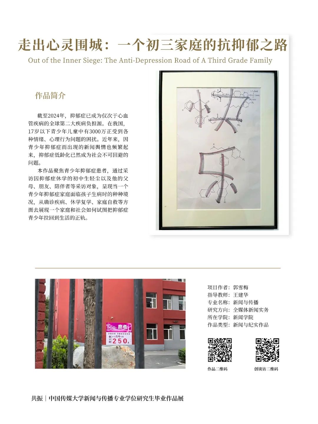 作品《走出心灵围城:一个初三家庭的抗抑郁之路》聚焦青少年抑郁症患者,通过采访因抑郁症休学的初中生轻尘以及他的父母、朋友、陪伴者等采访对象,呈现当一个青少年抑郁症家庭面临孩子生病时的种种境况,从确诊疾病、休学复学、家庭自救等方面去展现一个家庭和社会如何试图把抑郁症青少年拉回到生活的正轨。