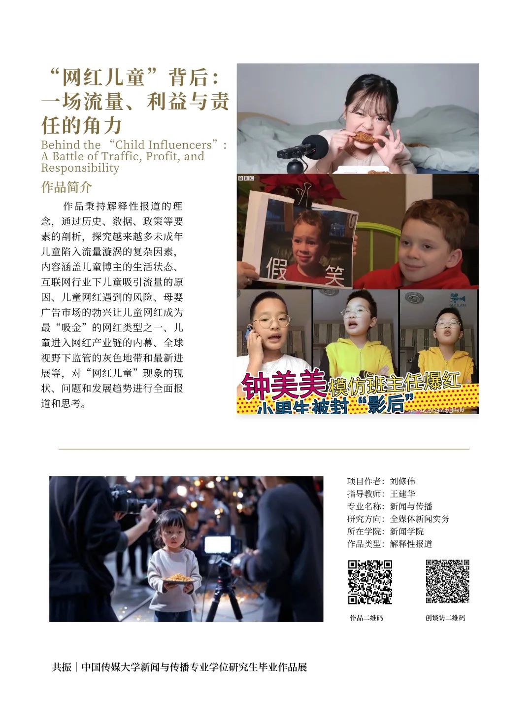 作品秉持解释性报道的理念,通过历史、数据、政策等要素的剖析,探究越来越多未成年儿童陷入流量漩涡的复杂因素,内容涵盖儿童博主的生活状态、互联网行业下儿童吸引流量的原因、儿童网红遇到的风险、母婴广告市场的勃兴让儿童网红成为最“吸金”的网红类型之一、儿童进入网红产业链的内幕、全球视野下监管的灰色地带和最新进展等,对“网红儿童”现象的现状、问题和发展趋势进行全面报道。