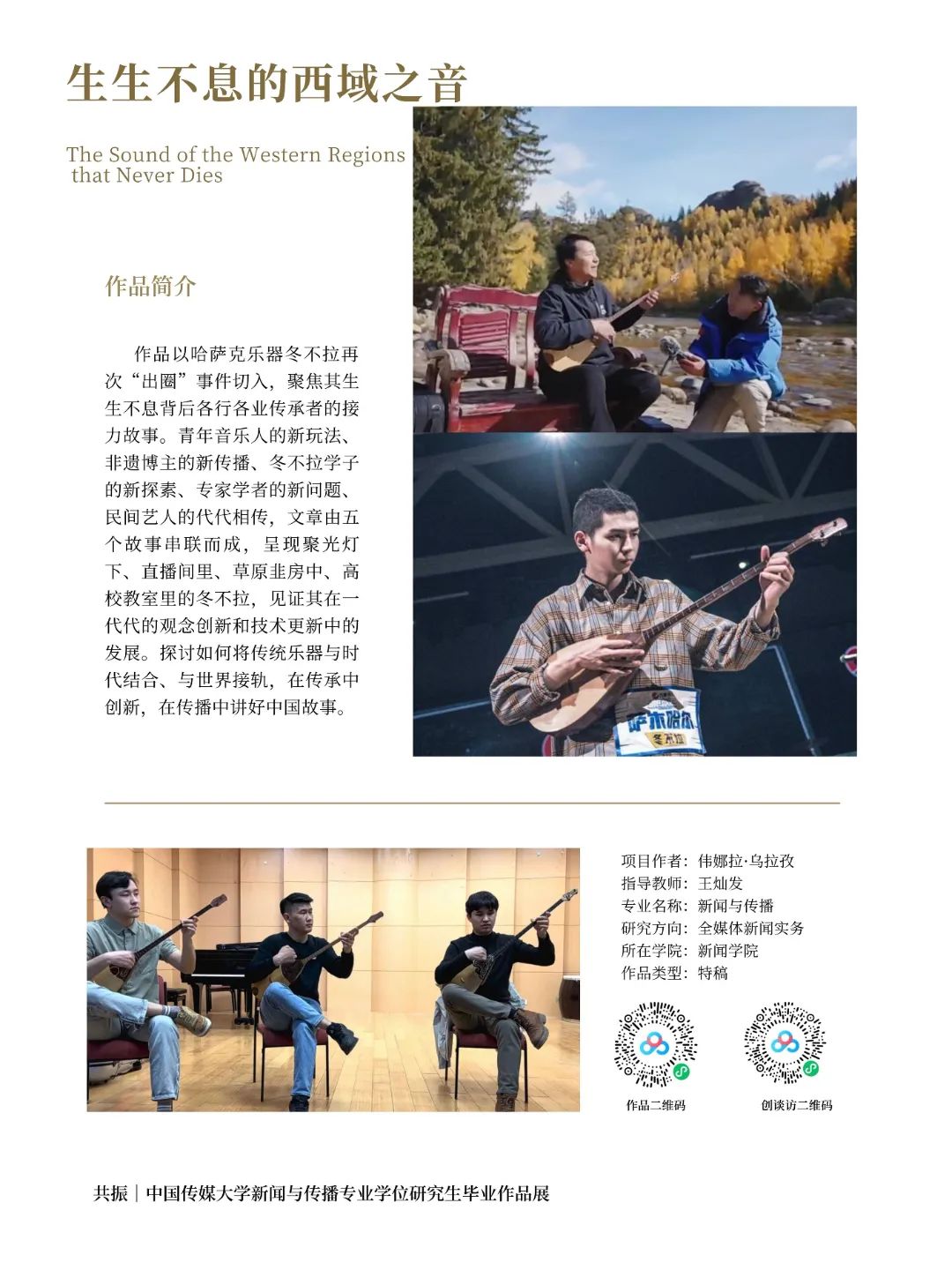 作品以哈萨克乐器冬不拉再次“出圈”事件切入,聚焦其生生不息背后各行各业 传承者的接力故事。青年音乐人的新玩法、非遗博主的新传播、冬不拉学子的新探素、专家 学者的新问题、民间艺人的代代相传,文章由五个故事串联而成,呈现聚光灯下、直播间里、 草原韭房中、高校教室里的冬不拉,见证其在一代代的观念创新和技术更新中的发展。探讨 如何将传统乐器与时代结合、与世界接轨,在传承中创新,在传播中讲好中国故事。