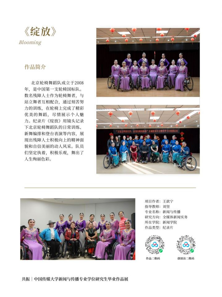 “90后”的庄园作为一名初出茅庐的“乡村CEO”,也就是乡村职业经理人,需要以外乡人的身份融入陌生的村庄。她与海归村支书赵坚均一拍即合,希望可以在香榧丰收季帮助村民增收致富,推动香榧产业转型和村庄品牌化运营。为此,庄园主动驻村,拍摄下乡短视频,入户调研助农需求,和团队一起设计推出村级公用品牌“上英园”的香榧包装。在此期间,传统榧农对“新农人”庄园产生误解,村民老观念与“新农人”新理念碰撞出了别样的火花。北京轮椅舞蹈队成立于2008年,是中国第一支轮椅国标队。数名残障人士作为轮椅舞者,与站立舞者互相配合,通过刻苦努力的训练,在轮椅上完成了精彩优美的舞蹈,尽情展示个人魅力。纪录片《绽放》用镜头记录下北京轮椅舞蹈队的日常训练、新舞编排和登台表演等内容,展现出残障人士积极向上的精神面貌和自信美丽的动人风采。队员们坚定执着,积极乐观,舞出了人生绚丽色彩。