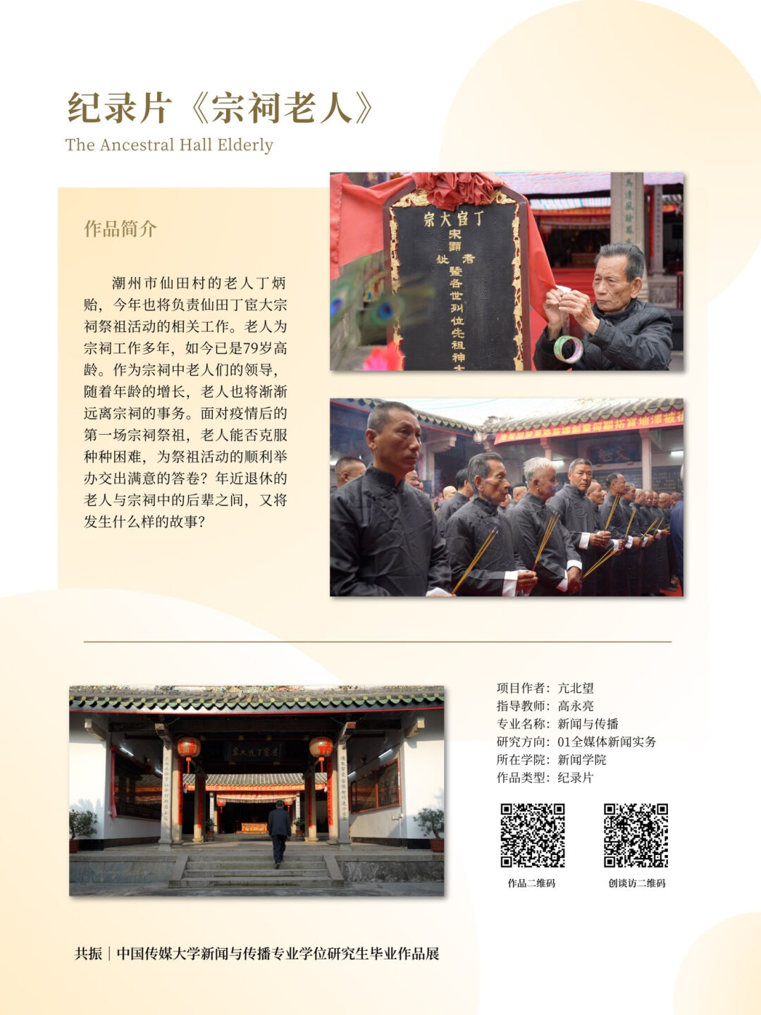 潮州市仙田村的老人丁炳贻,今年也将负责仙田丁宦大宗祠祭祖活动的相关工作。老人为宗祠工作多年,如今已是79岁高龄。作为宗祠中老人们的领导,随着年龄的增长,老人也将渐渐远离宗祠的事务。面对疫情后的第一场宗祠祭祖,老人能否克服种种困难,为祭祖活动的顺利举办交出满意的答卷?年近退休的老人与宗祠中的后辈之间,又将发生什么样的故事?